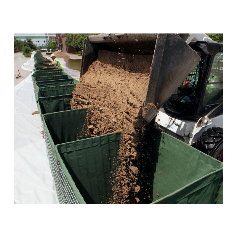 Unité récupérable doublée de géotextile pour une utilisation générale comme barrière remplie de terre. Les unités conviennent pour être remplies de terre, de sable, de gravier, de roche concassée et d'autres matériaux granulaires. L'unité répond à un large éventail d'utilisations, y compris la construction de murs et de barrières de protection.